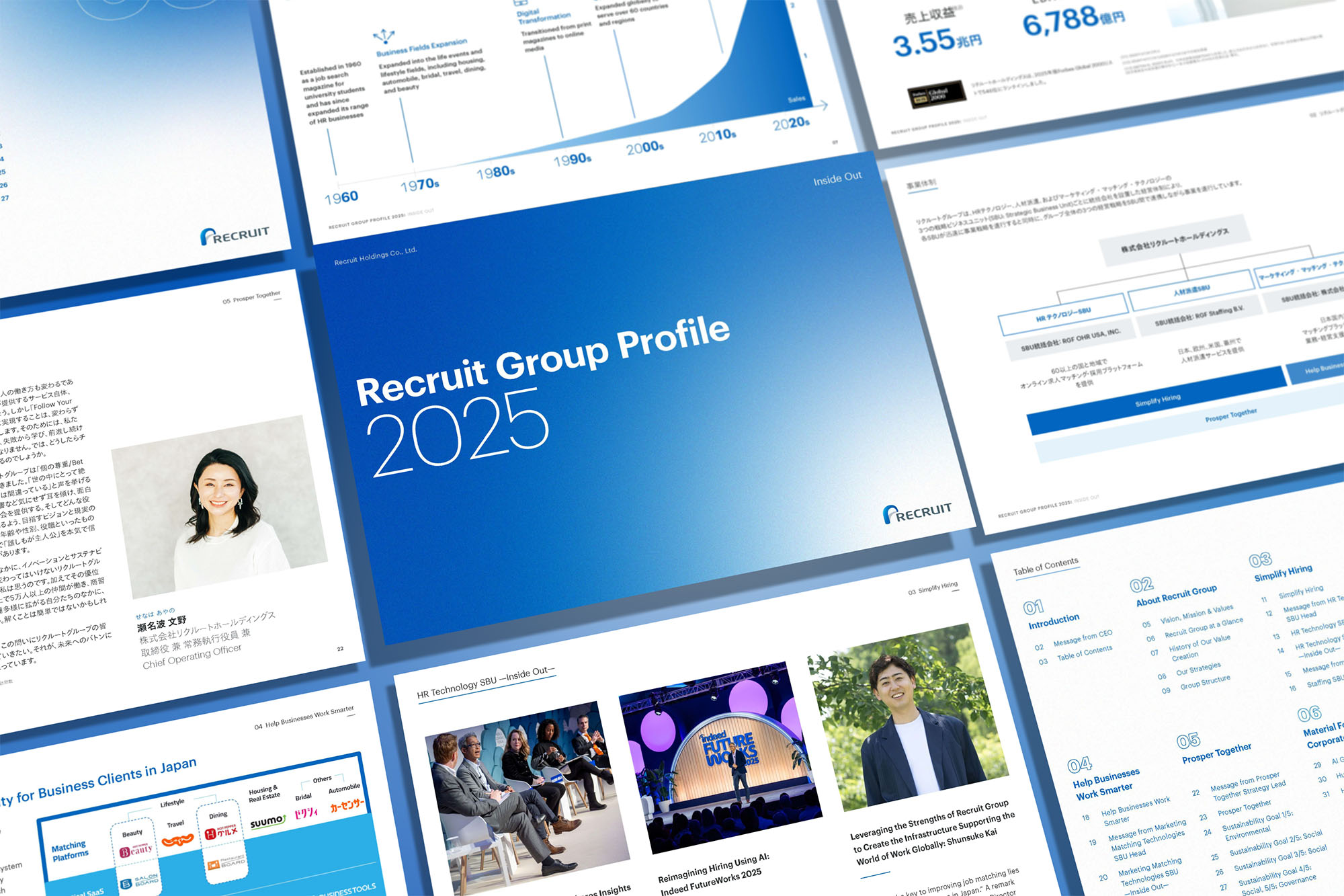 Recruit Group Profile (RGP) is Recruit’s group introduction media, bringing strategy and progress into one clear format. For 2025, we visualized a shift in mode: energy and forward motion with unity, avoiding hard splits and aligning with Recruit’s color palette.